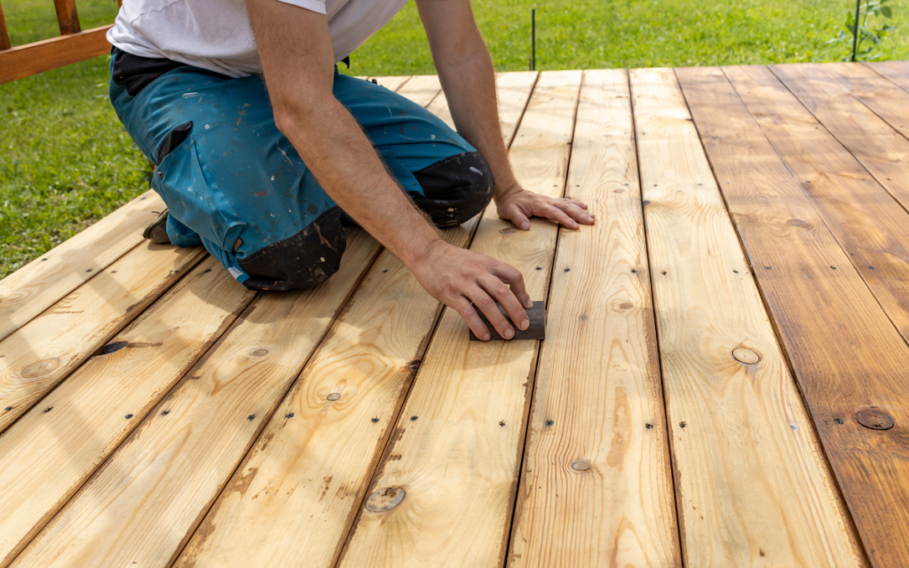 Once dry, spot sanding or strip sanding will prep the surface for the new stain.